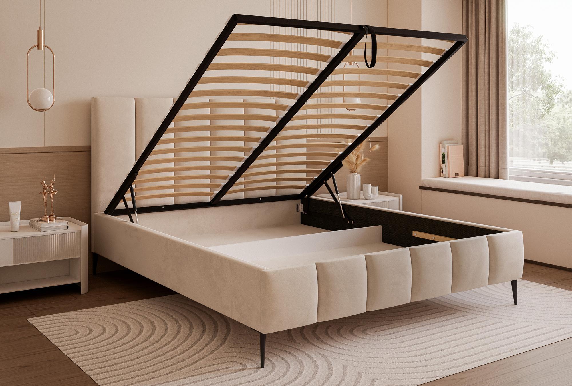 Milo SLIM na nóżkach to idealne połączenie nowoczesnego wyglądu i funkcjonalności. Wyraźne pionowe pasy, wykonane z miękkiej pianki 3 cm na zagłówku i przodzie łóżka, tworzą przytulny, ale elegancki klimat sypialni.