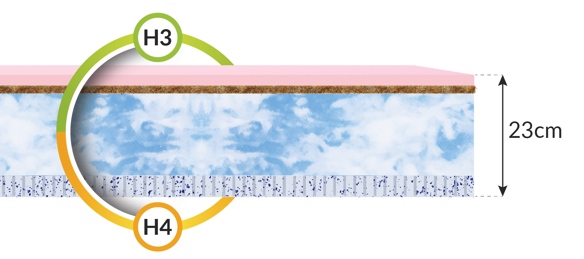 Dla lepszej stabilizacji dodano warstwę kokosu, która delikatnie utwardza powierzchnię i zwiększa trwałość. Elastyczny lateks dopasowuje się punktowo do ciała, a warstwa pianki VISCO reaguje na temperaturę, modelując się do kształtu użytkownika, co wspiera zdrowe ułożenie kręgosłupa.